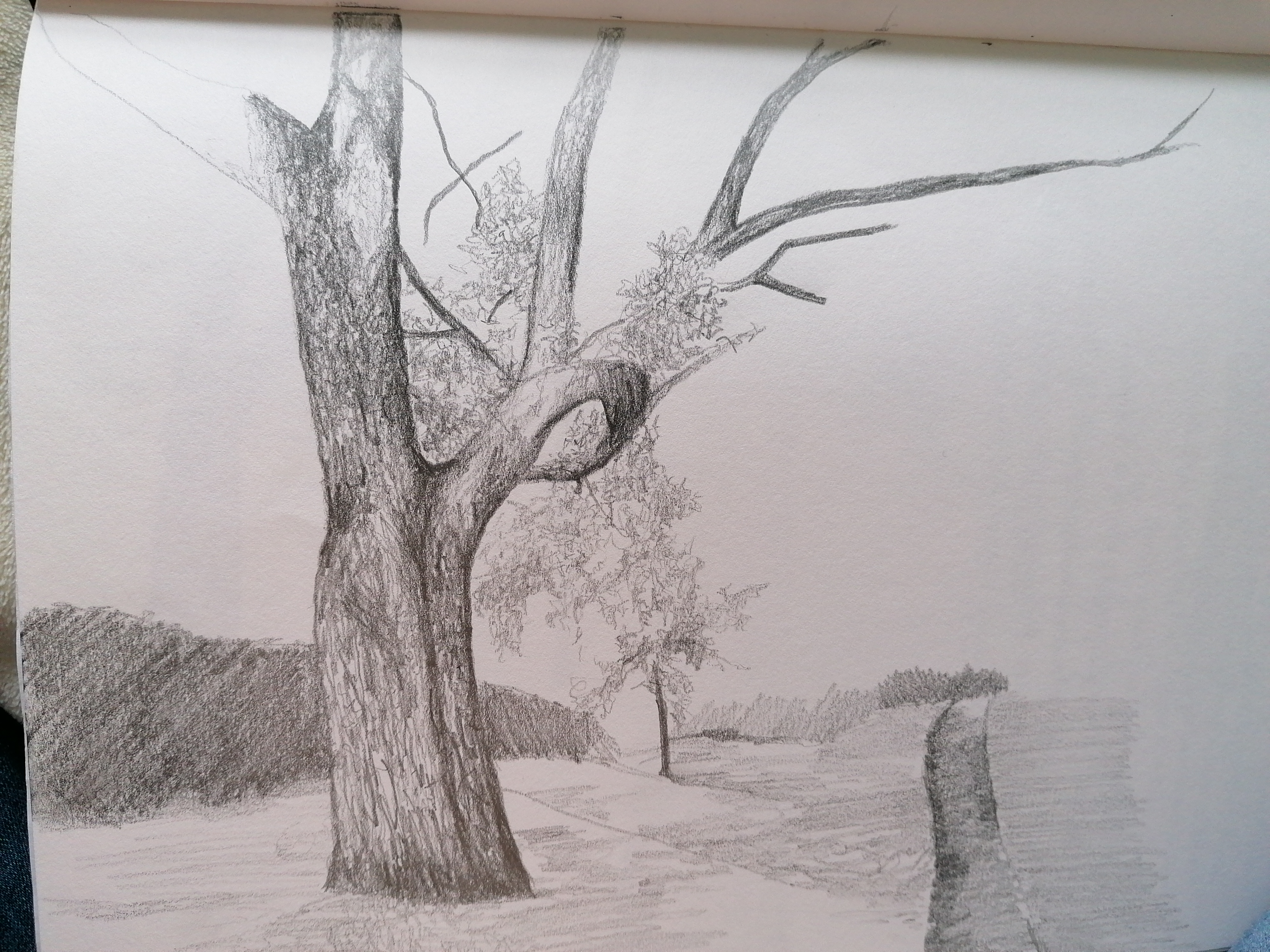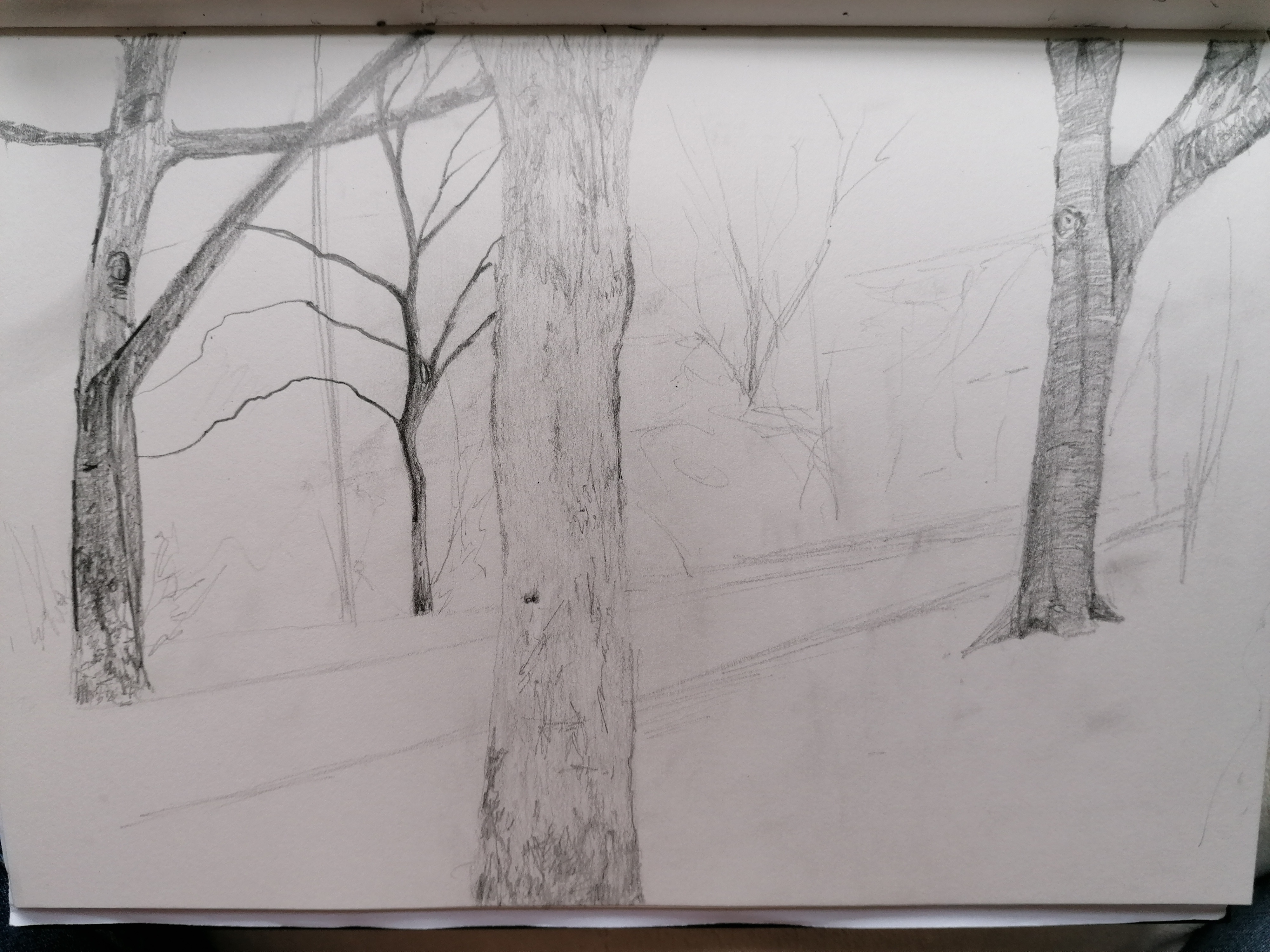 Feeling compelled to investigate my fascination with trees, I decided to take my sketchbook and and sit on a bench along the walkway towards the school of art. The detail of the tree gripped my attention and also the way in which the trees seemed to welcome you along the route they line.