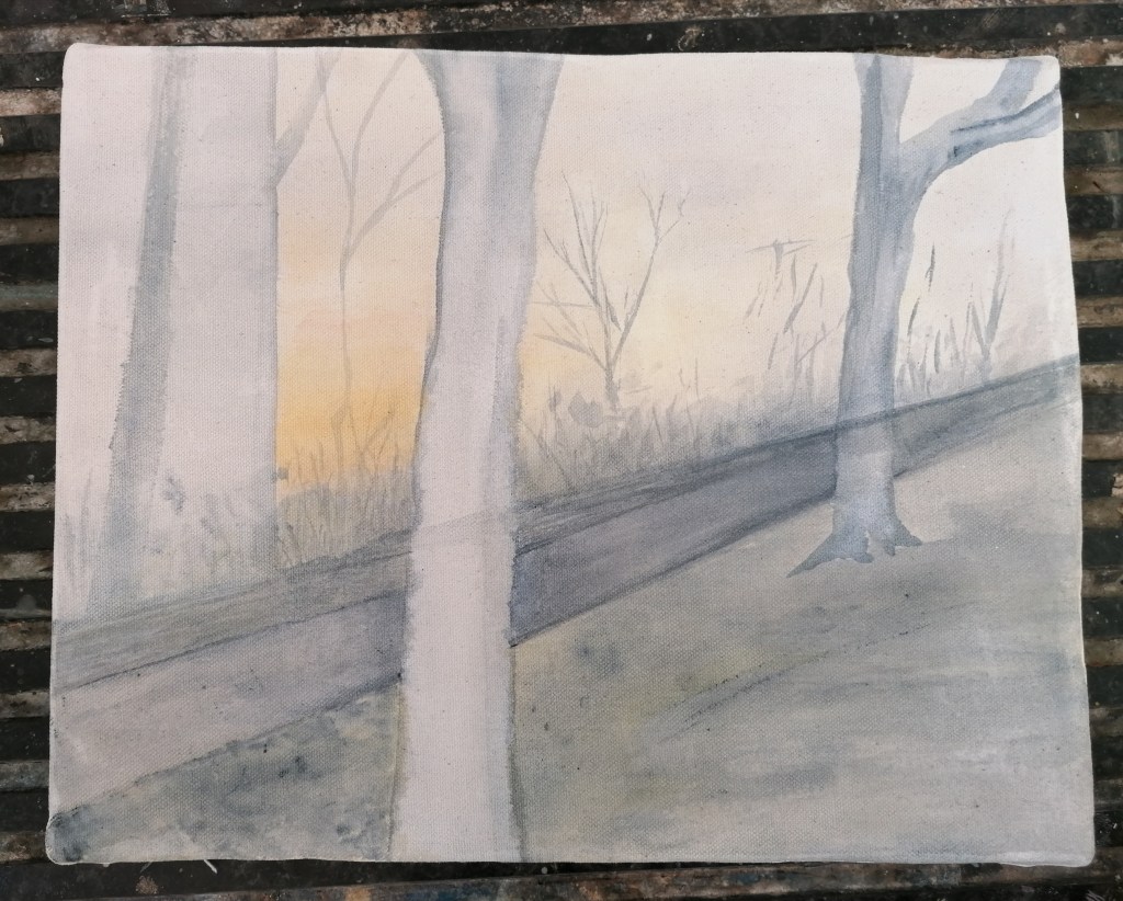From this sketch, I decided to test my memory by painting the scene. With only my drawing and brief descriptive notes on the colours present, I found it much harder to construct a painting, than if I were to work on location. The lack of visual references meant that I was particularly uninspired to create a painting. I feel that in future, I should stick to travelling out on to my locations and painting whilst there, this will then enable me to make full use out of all my visual information!