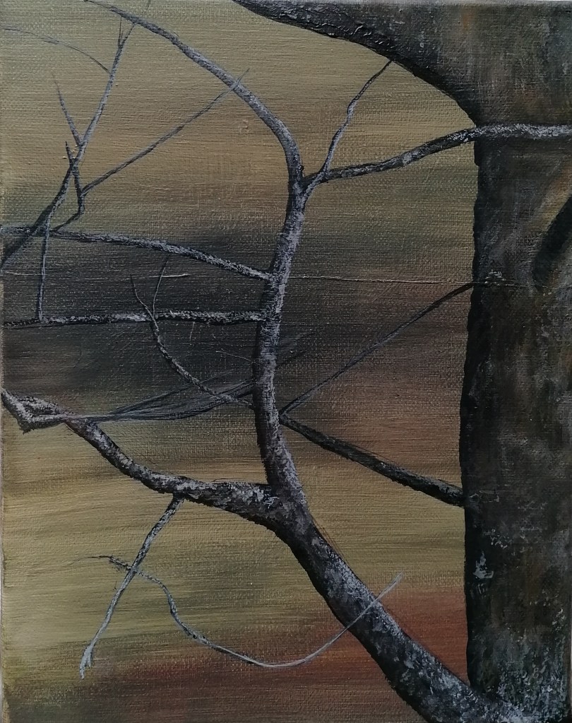 On my most recent trip to Nant Yr Arian, I was instantly drawn to a tree of which its leaves had already made their transformation to a copper/yellow and were slowly falling. Intrigued by a particular section of the tree which had been exposed through the departure of its leaves, I set out to paint it. Unlike previous works, which have mostly represented a distant view, I focused in on the part which captured my attention! Instead of creating a detailed background, I mixed up colours present behind my subject (rolling hills and forest) and quickly applied them to my canvas. By doing this, I was able to spend ore time on representing the detail of my chosen subject, in order to work out what it was that grasped my interest. I decided not to include the remaining leaves which were present in the scene, as I didn’t feel that it would add to the painting in any way. Similarly to my previous painting, I have been able to manipulate the painting through a selection process. I feel that in future, this process of working will allow me to create paintings which can evoke particular feelings.