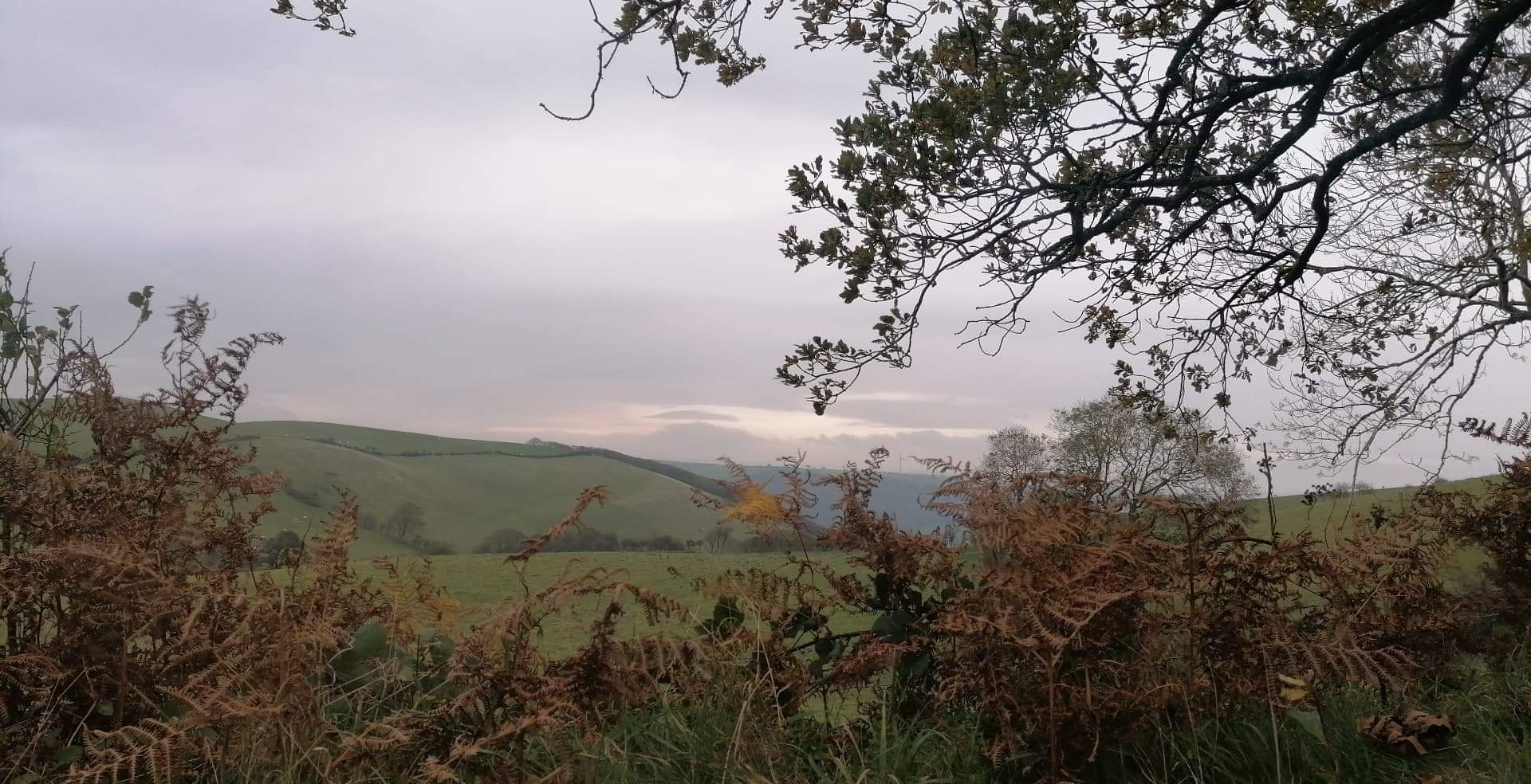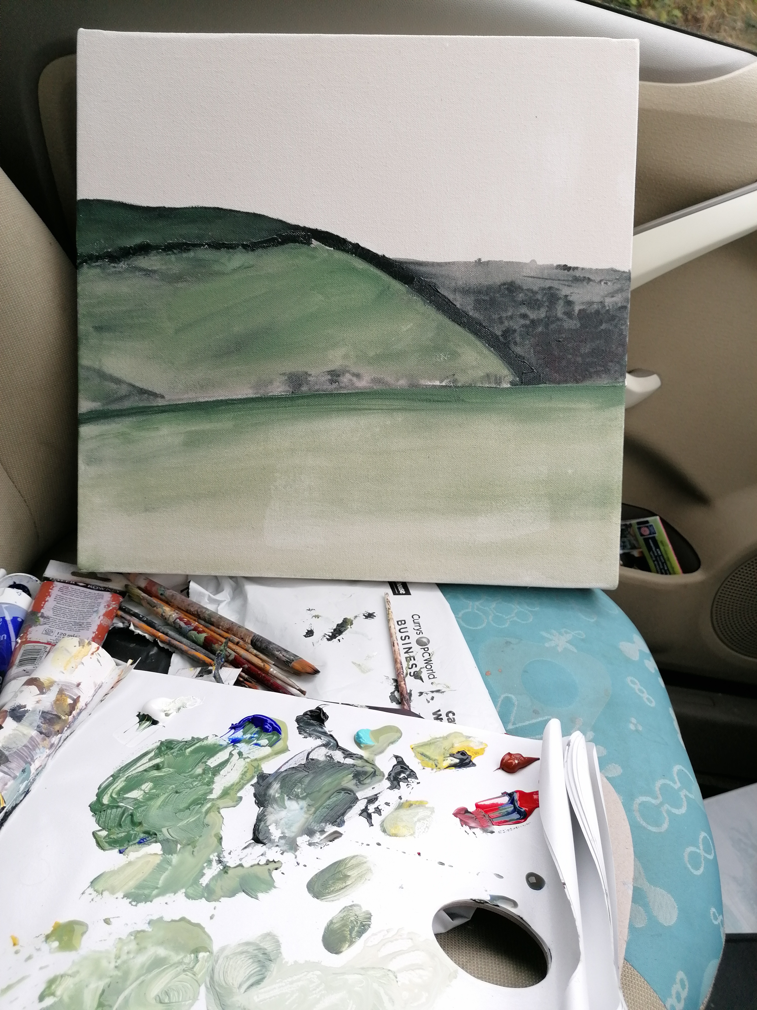 This morning I set out on a trip to find a place where I could paint the mist, which I had seen from my bedroom window, rolling down over the distant hills. I ended up driving along a country road towards a campsite I used to stay when I was younger. The road took me along the top of hills which hosted stunning views of the fields below and dark hills in the distance. Once I had found a suitable place to stop (somewhere I wouldn’t get stuck in the mud, or roll down a hill!) I determined my composition and started to mix paints. Shortly after I had completed my under painting, the scene in front of me had completely transformed into a blurred cloud of rain!