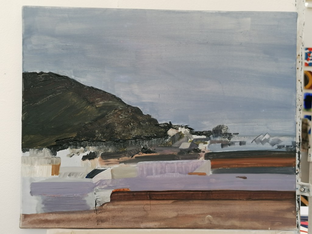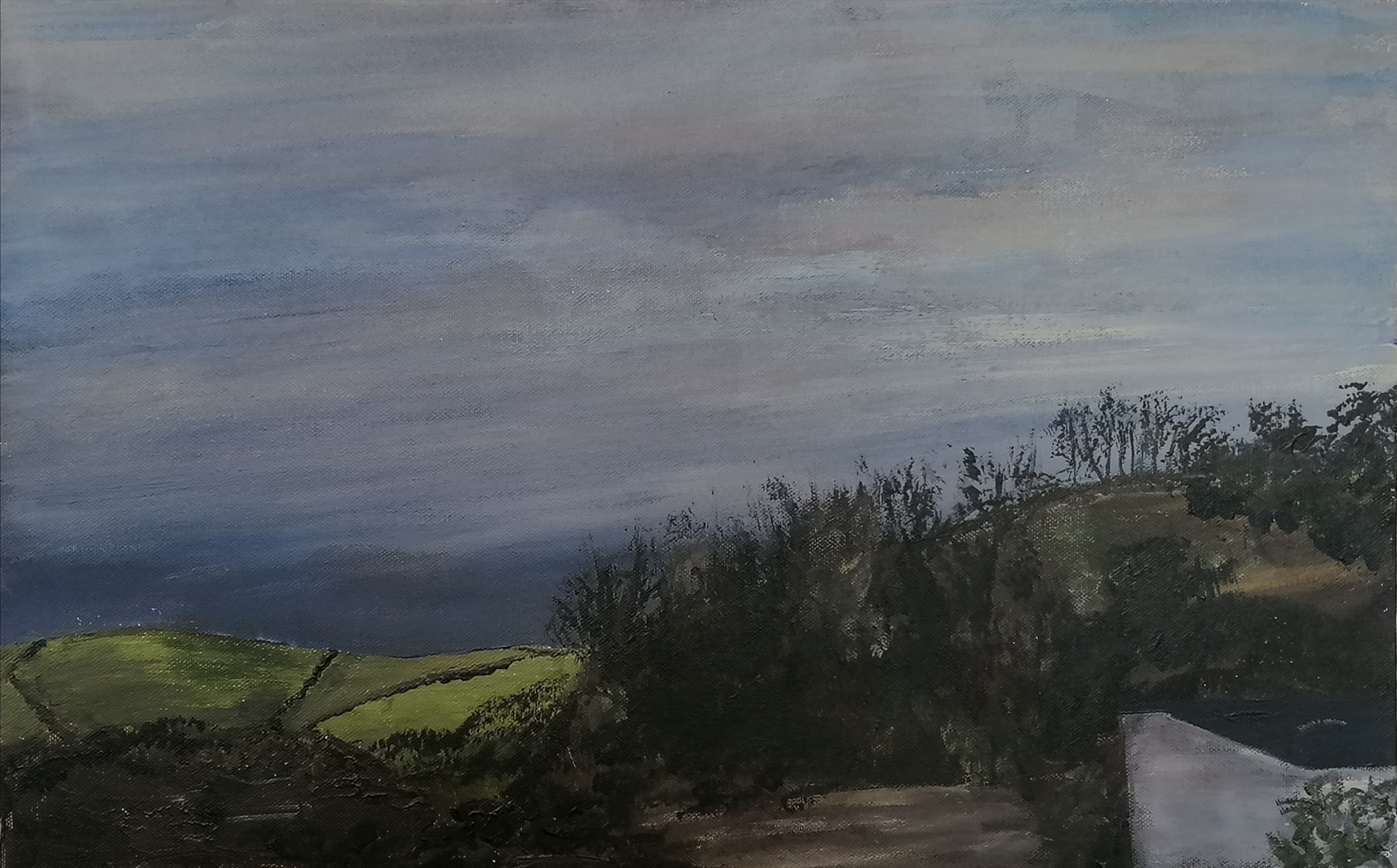 Yesterday afternoon, I set up my easel in our loft room- which has a sky light! Instead of travelling anywhere, I felt that this view provided me with the perfect opportunity to paint! At first, I focused on capturing the sky, however the light changed so much that it was much more difficult than I had initially assumed. After layers of paint, I started to block out the landscape with my pallette knife and used different sized brushes to create an impression of the landscape before me.