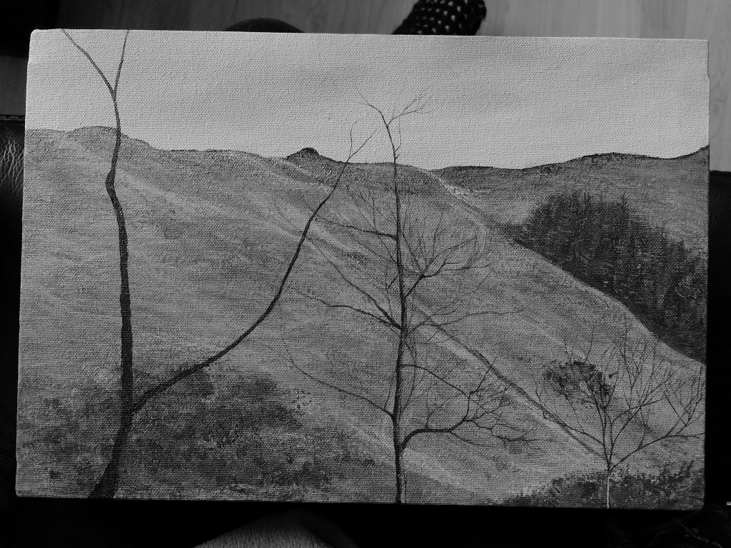 I decided to fill in the area of sky with a solid colour, due to the amount of detail that was present within the rest of the scene. I wanted the sky to correspond with the landscape but to not overpower the composition with excessive detail. I also felt that the top of the hills needed to be more defined, in order to create an even starker contrast within the painting.
