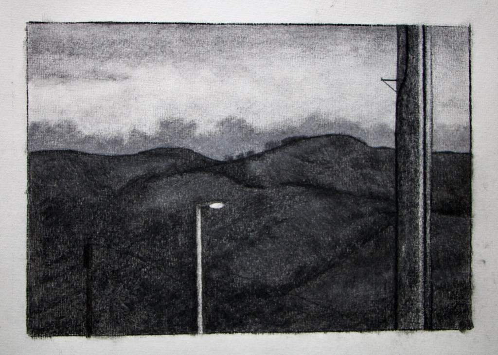 In our house, the only landscape I have visual access to is the small section of hillside, which is framed by the gap between two houses, from my bedroom window. I am actually really grateful for this tiny proportion of landscape I have and find myself looking at it several times a day to see the effect the daylight has upon the hills.