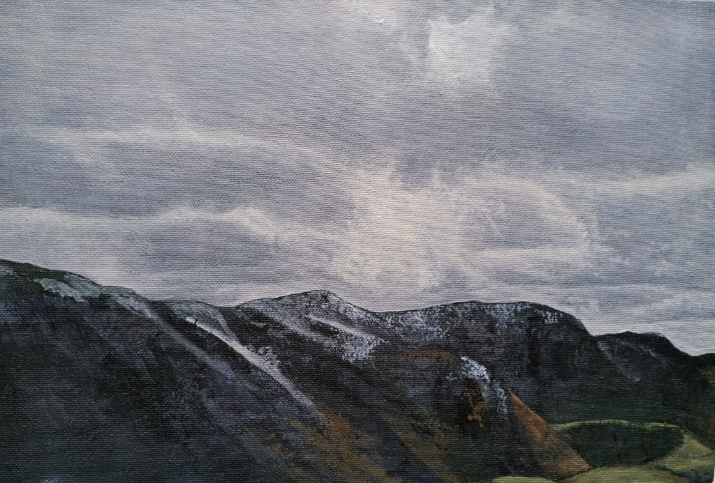 I decided to spend the day in my room, sheltered from the stormy weather, and create a cloud study. This was much harder than I had expected. As the clouds swept past my view, my acrylic paints seemed to dry more quickly than ever, making it difficult for me to blend the tones and highlights of the cloud formations. I was then reminded of why I hadn’t previously spent much time depicting the sky (especially when working on location), I’d be wasting hours trying to get it “just right”!