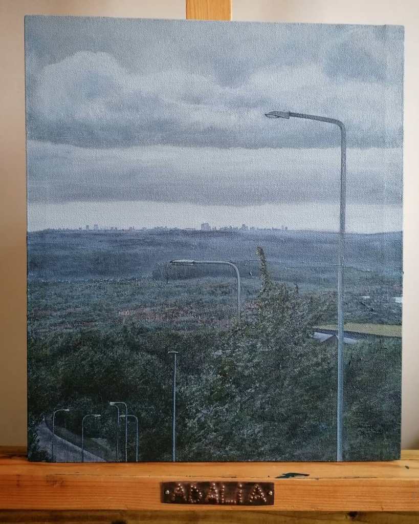 When painting the view, I was reminded of my final piece at college, which I named: “I can see the sea”. Although very different types of painting, completed three years apart, both of these paintings marked a new beginning. “I can see the sea” represented a special bond between me and my little sister, set in Aberystwyth, where I would soon relocate. The location this painting was set in was hugely significant, however it did not occur to me, until after I started university, just how much the landscape would influence my artwork.
