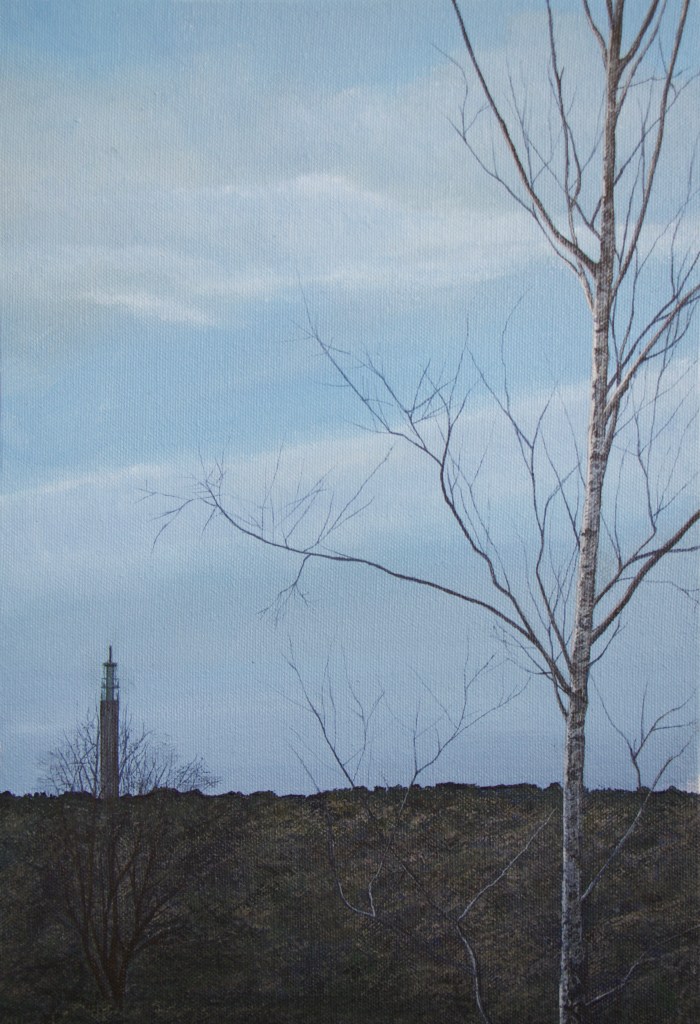 One of the most obvious disruptions within the landscape where we live is the Pye Green Tower, situated right on the edge of Cannock Chase. This structure protrudes above the treetops of the forest, providing a point of reference for us at all times. Its dominant presence within the forest inspired the painting Home is where the Tower is. The intrusion of this contemporary structure within this space is accentuated by the portrait orientation of the canvas and the contrasting forms of the trees.