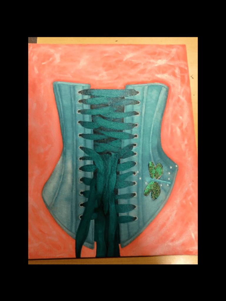 I haven’t worked with oil paints since I created my final piece for a GCSE art exam, back in school. I created a painting of a corset, for a project called “spirals”. Oils were a great medium for this subject, as I was able to blend the colours to create a depiction of silk on the canvas. I really enjoyed working with this medium at the time, but when I went to College I was absorbed by other mediums, such as gouache and charcoal. At University, our workshops mainly consisted of the use of acrylics, where I first created a landscape. I continued to practice with acrylics throughout my whole time in Aberystwyth. However, recently I have been curious to see what my work would be like using oils.