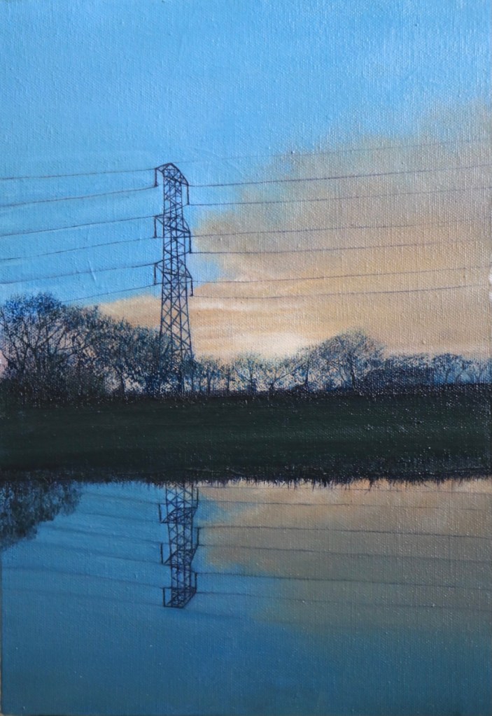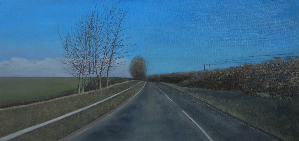 I decided to use oils to create a small series, using my car’s Dashcam as reference material for paintings. When driving, I always spot potential compositions for artwork, but I am unable to stop and take a picture. My Dashcam, however, is continuously on during these journeys, and it’s footage would eventually be deleted. I decided to look back at these recorded journeys, to see if the camera had picked up any of these scenes I had been drawn to. The camera had, and although they weren’t great quality, I was inspired to use these images as reference material.