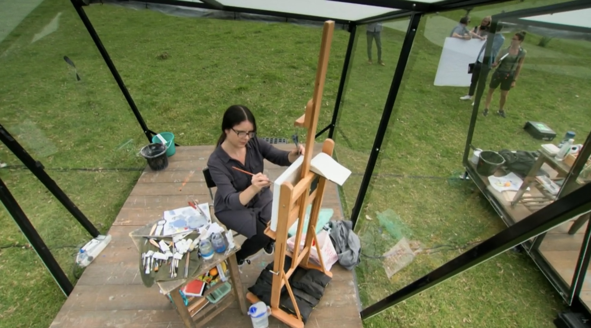Once we were all set up in our pods, we soon got to work! Although I often work from life, and can produce work in a short space of time, the four hour time-limit was a daunting prospect. As soon as Joan Bakewell and Stephen Mangan (the presenters of the show) officially started the competition, I quickly picked up my sketchbook and created a small thumbnail of my proposed composition. This sketch briefly described the proportions of my canvas and the placement of the visual information before me. Aware of the little amount of time I had to complete a whole painting, within 5 minutes of the competition I had put paint onto canvas and completed my under painting. My pace of working was of great shock to the judges and also the set crew around me, one of them joked: “you aren’t supposed to bring a finished painting, you know!”.