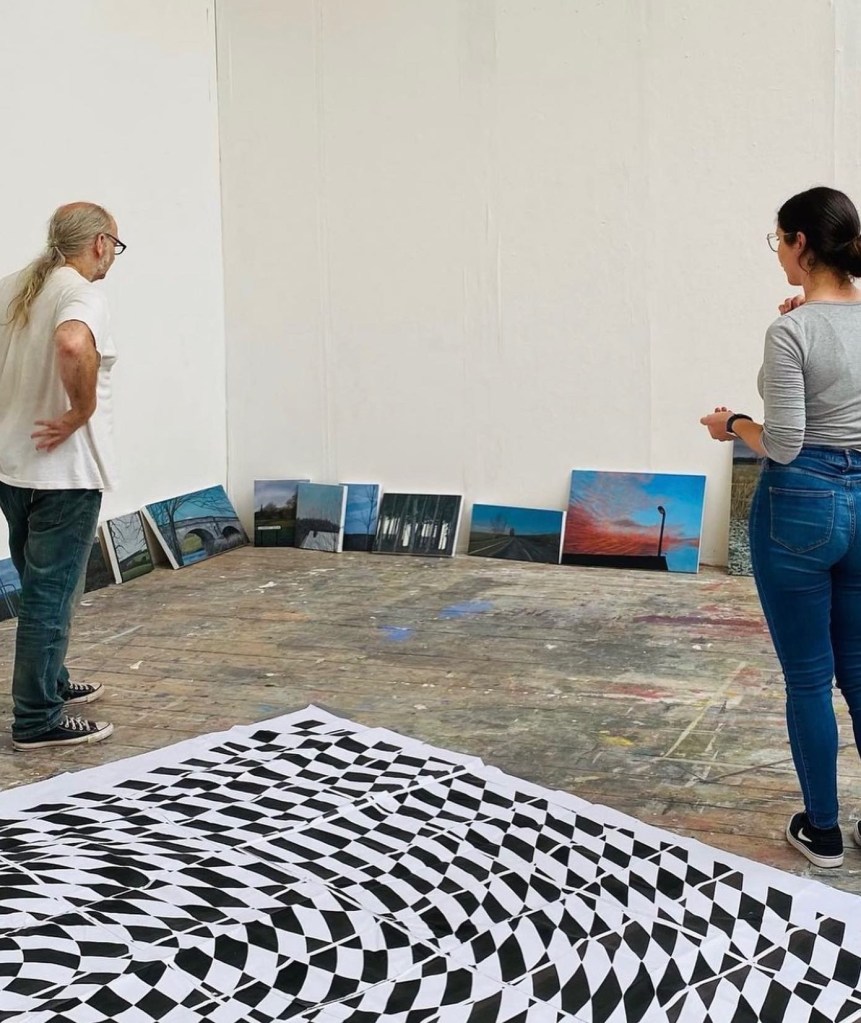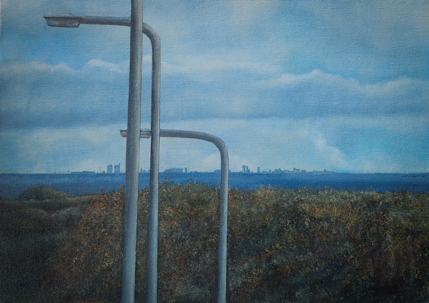 The painting My View at Twilight, 2020, was created just before I left Aberystwyth and presents a juxtaposition between the town and its mountainous surroundings. Featured in Sky Arts Landscape Artist of The Year earlier on this year, judge Kathleen Soriano commented: “we’ve got an artist finding something that is inconsequential but making it heroic.”. The Inclusion of contrasting structures (e.g., telephone poles) amongst natural landscapes has often been questioned, however, their presence is welcomed within my paintings, as they present a realistic contemporary existence. Without these features, my work could quite easily be lost within the landscapes of any previous century, thus their inclusion firmly places them within the current day. Birmingham on the Horizon was created as a follow-up of My View at Twilight, to express the difference of my surroundings today. The compositions I choose often present indistinct views, of which atmospherics play a significant role in their outcome as whole. As part of my reflection upon my arts based practice I have attempted to clarify here my interests, influences, and intentions as a landscape painter in 2022. This post comes at the end of my MA, when my final work is on display at Birmingham School of Art. Here, I will reflect upon my latests series of work, inspired by reading, exhibitions and first hand experience within the landscape.