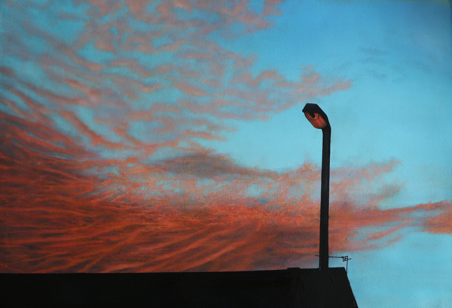 The 2022 exhibition, Radical Landscapes, described as an “immersive exhibition [which] reveals how landscape art has become a progressive genre” (Tate), explores our connections to the rural landscapes of Britain. Despite the exhibition’s focus upon rural imagery, I found that some of the themes explored within the work on display related to my own interests as an artist. In particular, the environmental concern that is expressed through Yuri Pattison’s installation Sunset Provisioning, relates to my own motives for Red Sky at Night. Likewise referring to the way in which sunsets often create a sense of awe, the compositional choice for this painting was inspired by a statement made by my high school chemistry teacher: “Pollution can be amazing, can’t it?! (pointing up at the fluorescent sky}.